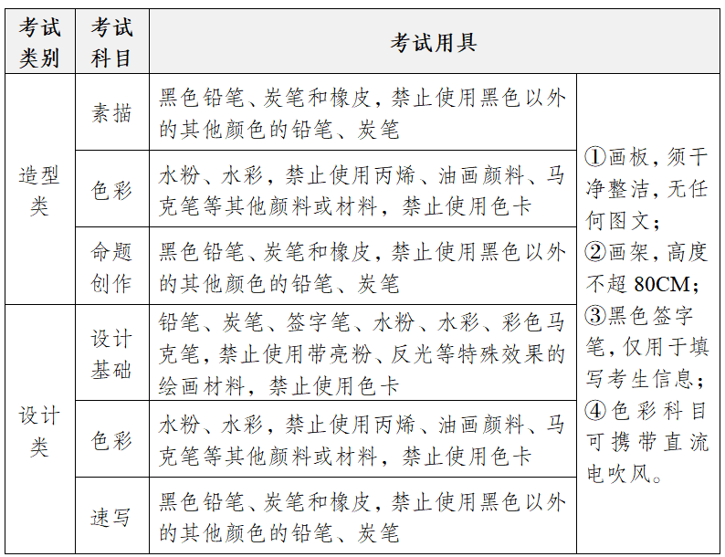 ①鉛筆、炭筆、簽字筆、水粉、水彩、彩色馬克筆,禁止使用帶亮粉、反光等特殊效果的繪畫材料,禁止使用色卡;